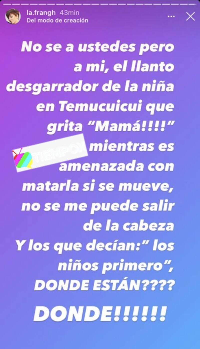 En sus historias de Instagram, la ex animadora de Canal 13 dijo: "No sé ustedes, pero a mí, el llanto desgarrador de la niña en Temucuicui que grita '¡Mamá!', mientras es amenazada con matarla si se mueve, no se me puede salir de la cabeza".