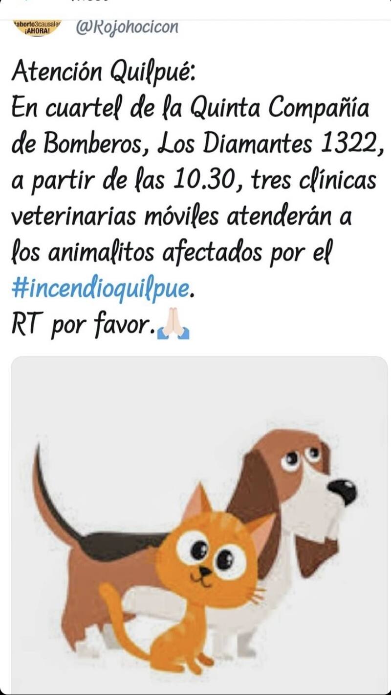 Dentro de la información dada por la cantante está el centro de acopio en ayuda a los animales damnificados, una lista de clínicas veterinarias que están recibiendo mascotas quemadas y una imagen que explica que cuartel de la Quinta Compañía de Bomberos estará atendiendo a los animales afectados.