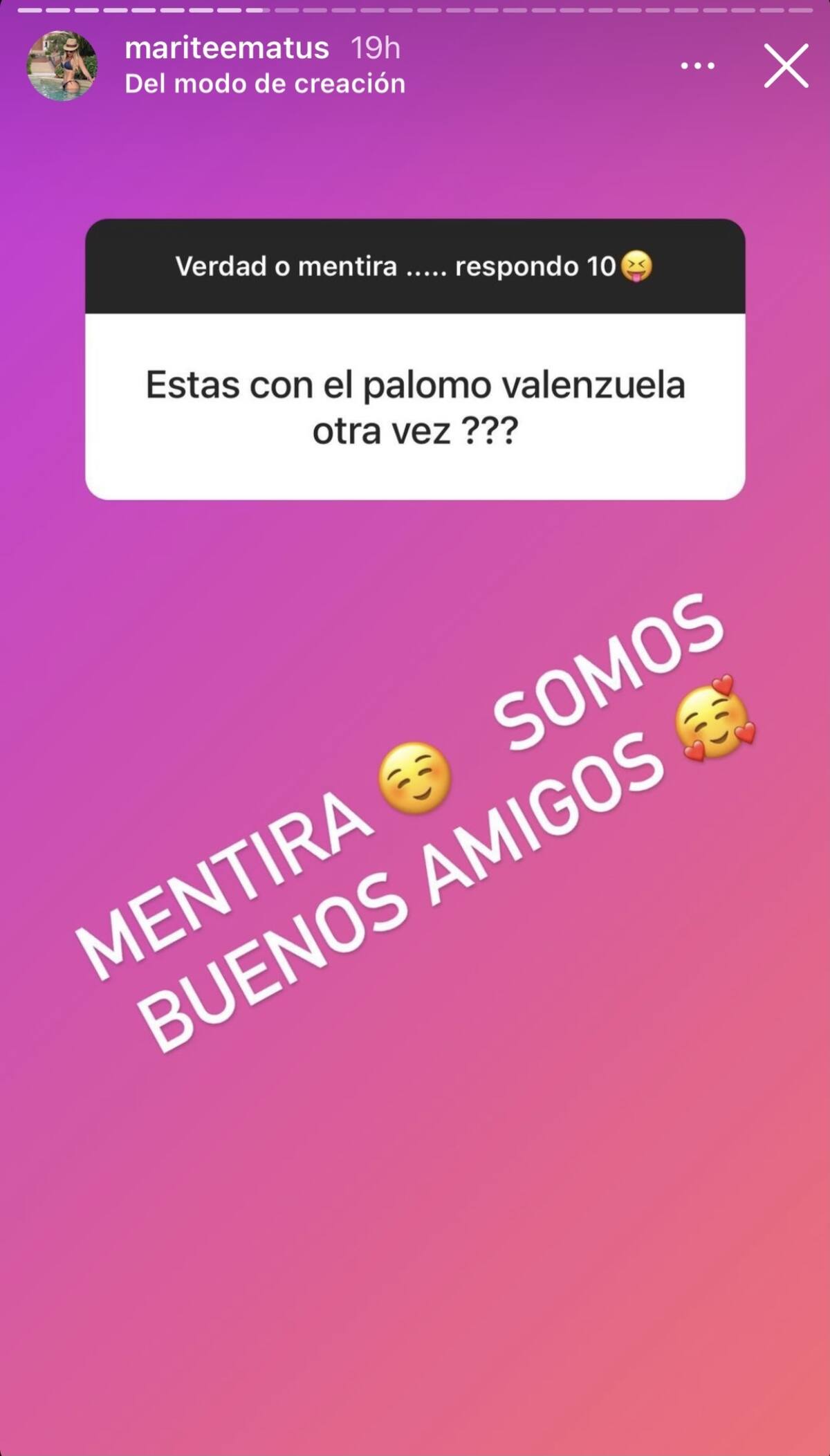 Claro que sus seguidores no se quedaron ahí y le preguntaron si estaba "¿con el Palomo Valenzuela otra vez?", a lo que María Teresa respondió: "Mentira, somos buenos amigos". Lo anterior acompañado de dos emoticones, uno de ellos con tres corazones en la cara.