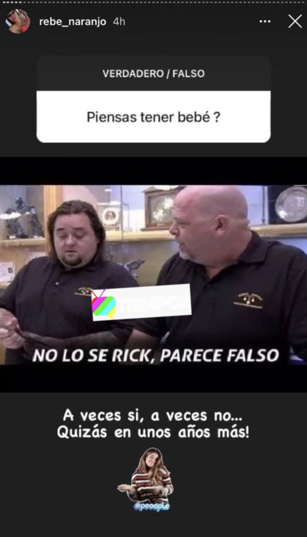 "¿Piensas tener bebé?", preguntó un curioso seguidor. "A veces sí, a veces no. ¡Quizás en unos años más!", contestó la polola del hijo de Raquel Argandoña, y acompañó su respuesta con el meme del "No lo sé Rick, parece falso", de "El Precio de la Historia" de History Channel.