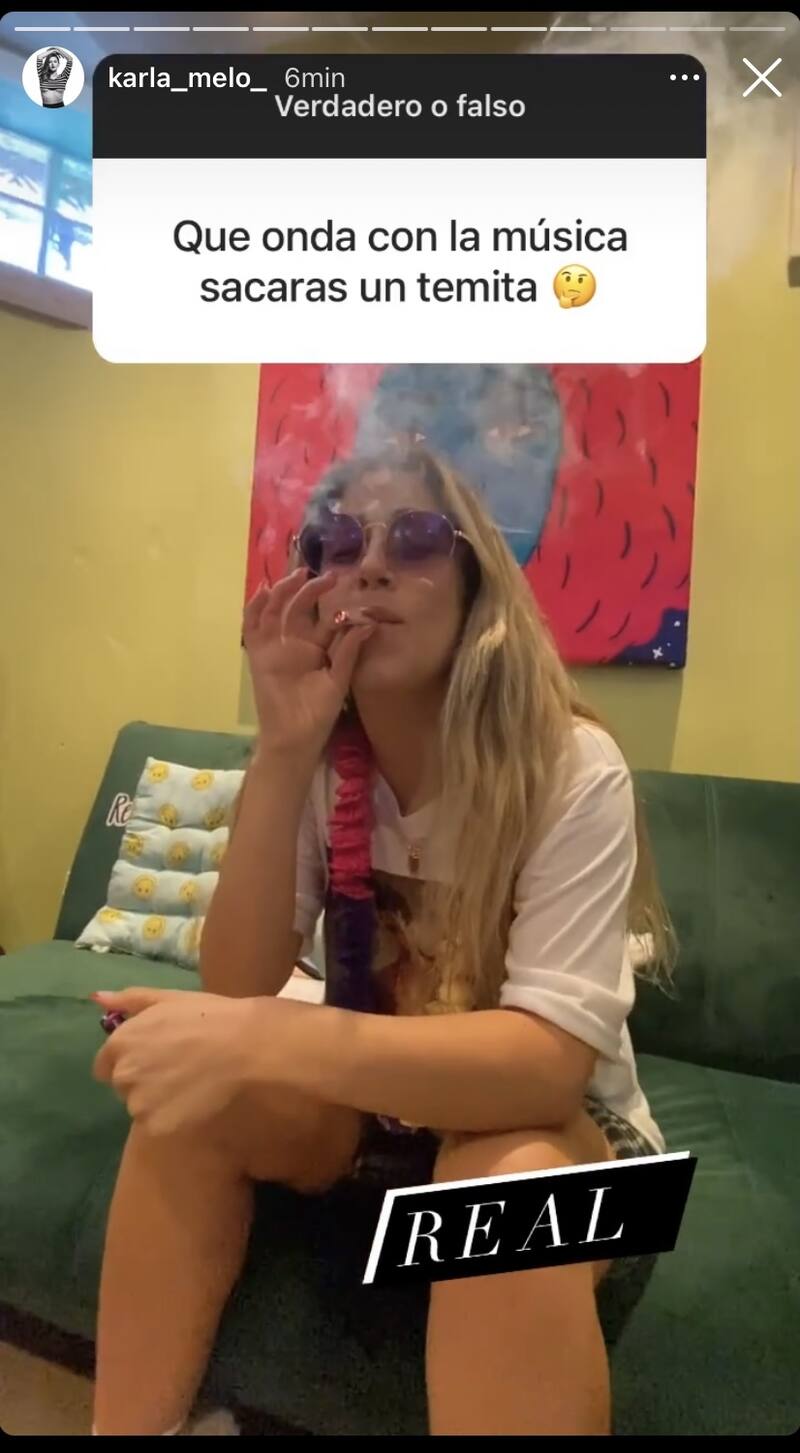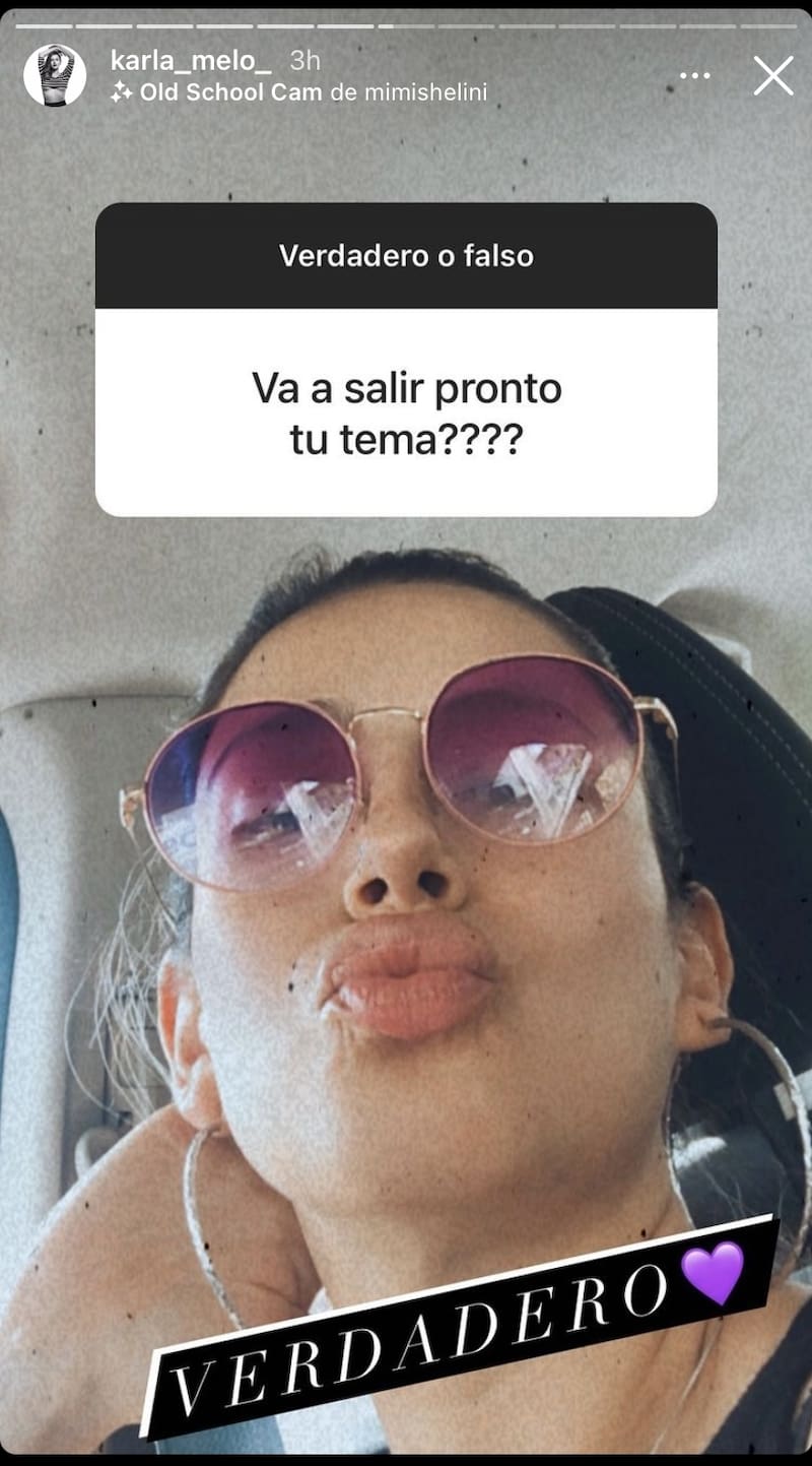 Ahora, Karla Melo sorprendió con una noticia en su cuenta de Instagram, ya que mediante el popular juego "verdadero o falso" en las historias, respondió "verdadero" a la pregunta: "¿Va a salir pronto tu tema?". Luego, le preguntaron: "¿Qué onda con la música?, ¿sacarás un tema?" y ella afirmó respondiendo "real".