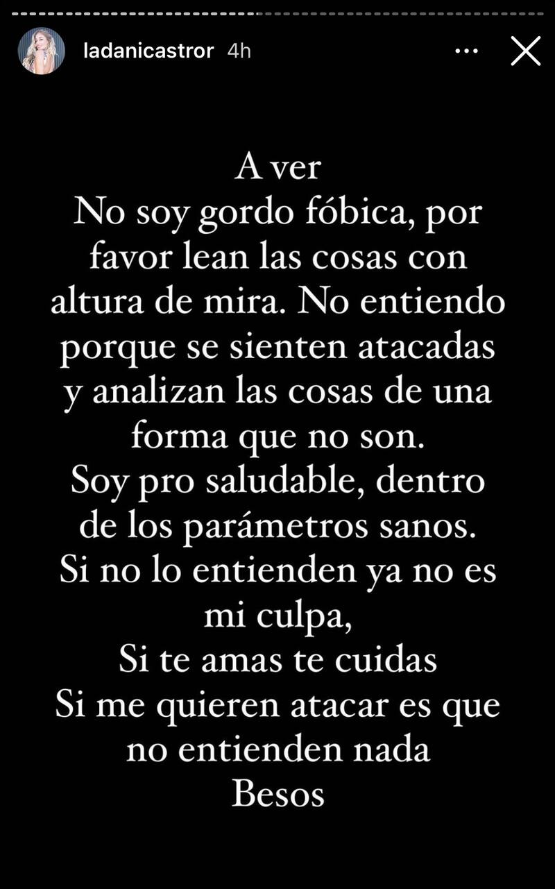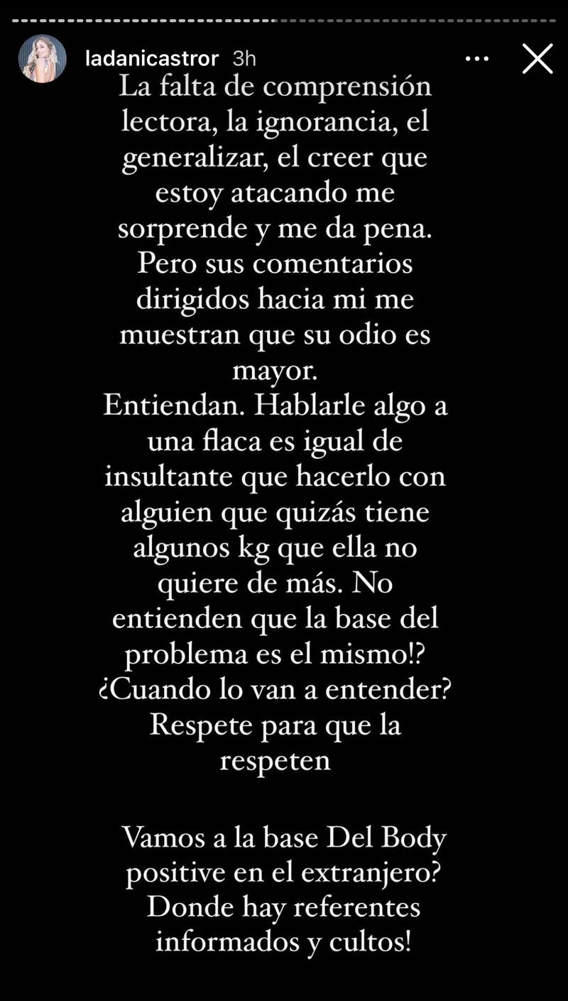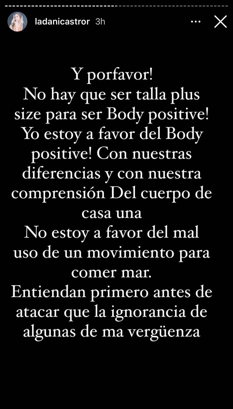 "Y porfavor! no hay para que ser talla plus size para ser Body Positive! yo estoy a favor del Body Positive! con nuestras diferencias y con nuestra comprensión del cuerpo de cada una. No estoy a favor del mal uso de un movimiento para comer mal. Entiendan primero antes de atacar, que la ignorancia de algunas me da vergüenza". finalizó Daniela Castro.