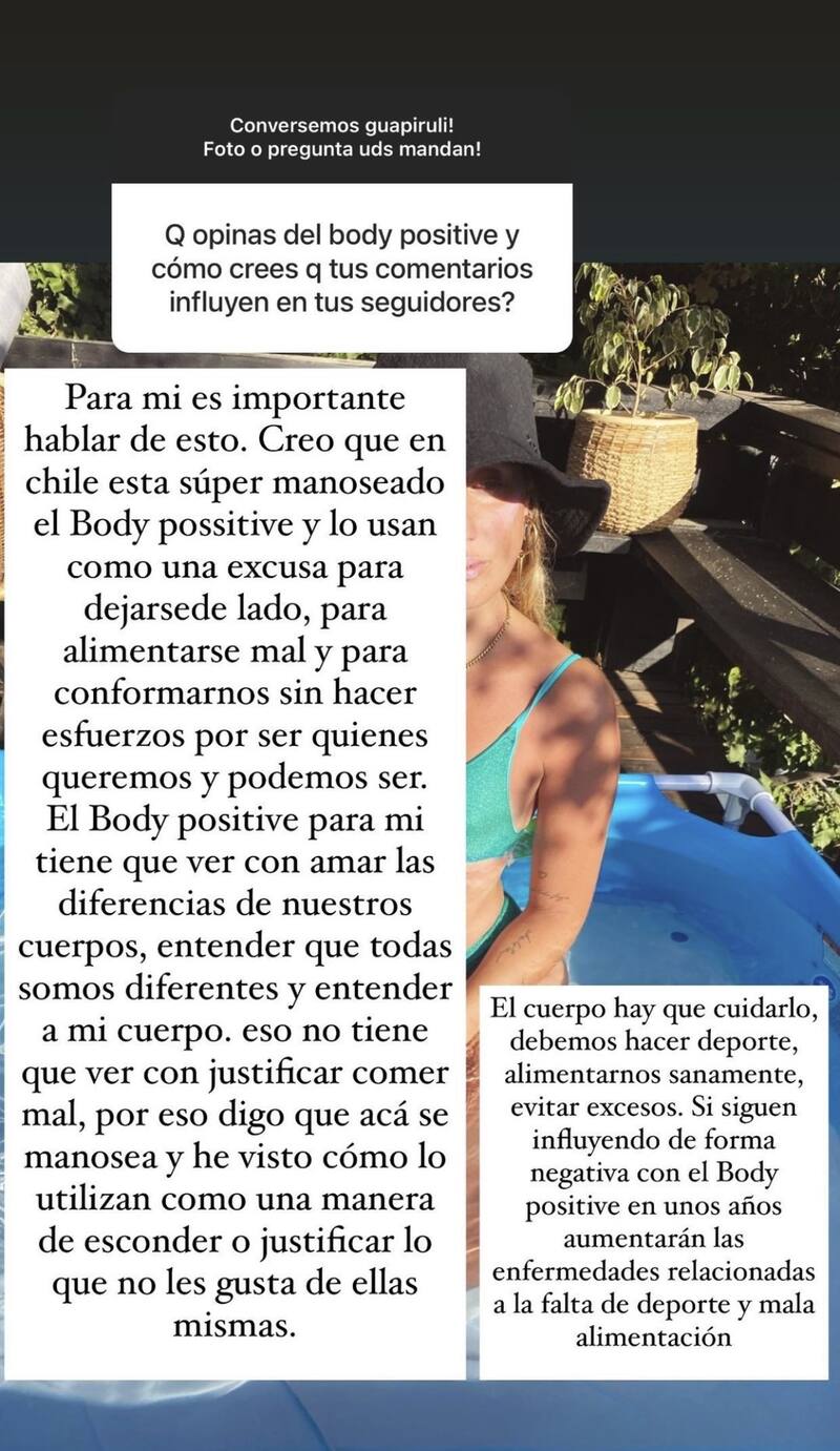 Por último, finalizó mencionando: "Y encuentro brígido como hay personas que se esconden tras el Body Positive para encontrar aprobación en los demás cuando en realidad no están felices con como son. Por eso yo digo, a mi no me gusta mi celulitis ni mis kilos subidos, no los voy a amar ni regalonearlos porque creo que es por comer chancho y no hacer deporte. Si fuera que mi cuerpo es así, obvio me amaría cuando sé que doy el 100% por ser quien quiero ser. El cuerpo y la mente se cuidan, cuando los cuidas los amas, es así de simple".