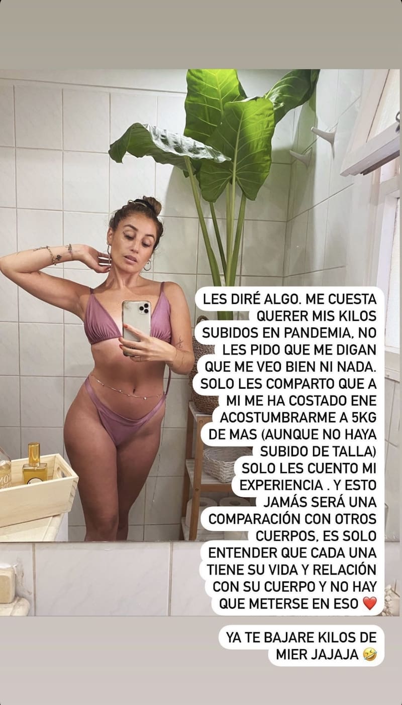 "Les diré algo, me cuesta querer mis kilos subidos en pandemia. No les pido que me digan que me veo bien ni nada, solo les comparto que a mi me ha costado ene acostumbrarme a 5 kilos de más (aunque no haya subido de talla)", partió comentando en sus historias.