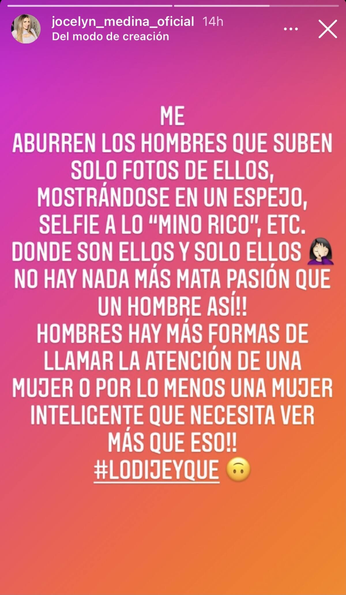 Jocelyn Medina, la ex participante de "Yingo" se expresó en redes sociales en contra de los hombres que quieren llamar la atención con la selfie de "mino rico", sin informar el motivo del mensaje, escribió en sus historias: