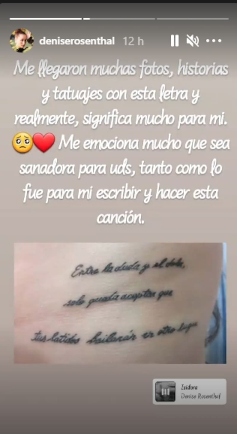 En específico, Denise Rosenthal difundió imágenes y testimonios de personas que conmovidas con “Isidora”, plasmaron parte de la letra de la canción en su piel.