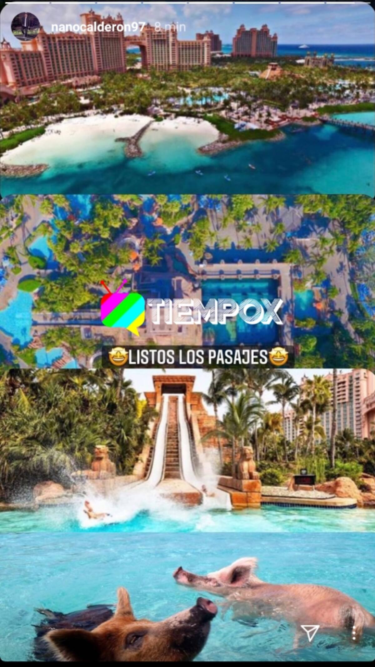 “Listo los pasajes”, escribió el hijo de Raquel Argandoña y Hernán Calderón Salinas, mostrando 4 fotos pertenecientes a las Bahamas, isla caribeña de gran atractivo turístico.