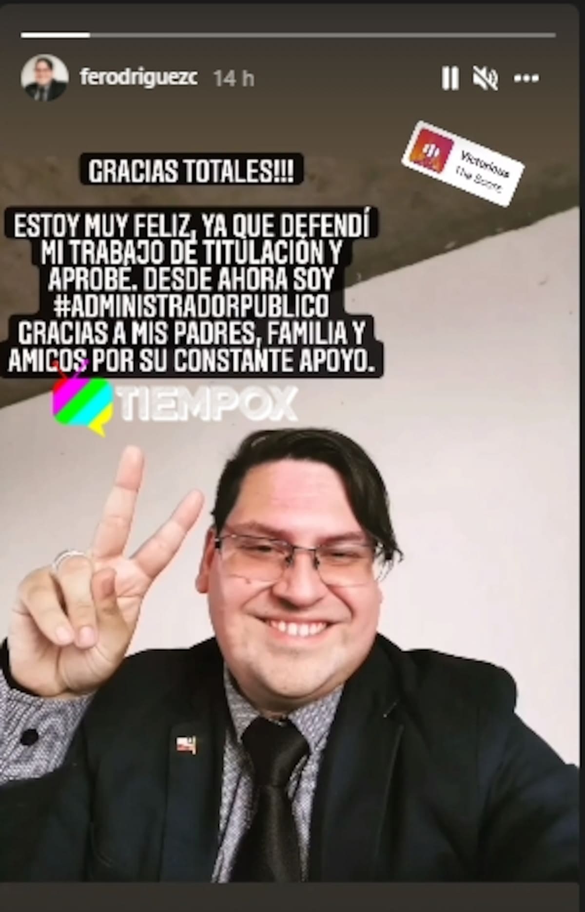 "Gracias Totales. Estoy muy feliz, ya que defendí mi trabajo de titulación y aprobé. Desde ahora soy Administrador Público", comentó Felipe Rodríguez, agradeciendo a Julio César Rodríguez y su familia.