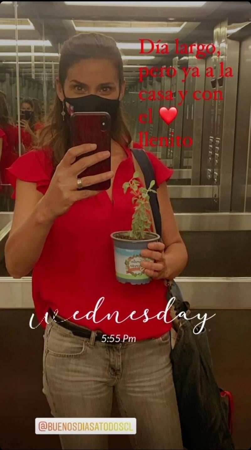 "Día largo pero ya a la casa y con el corazón llenito", escribió Carola Escobar en su Instagram mientras se toma una fotografía en el ascensor.