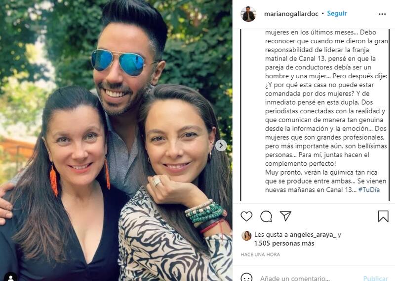 Mirna Schindler, en tanto, escribió: "Poniendo la mejor energía para comenzar un nuevo capítulo en mi vida profesional". Todo con una foto junto a su compañera y Mariano Gallardo, productor ejecutivo de "Tu Día".