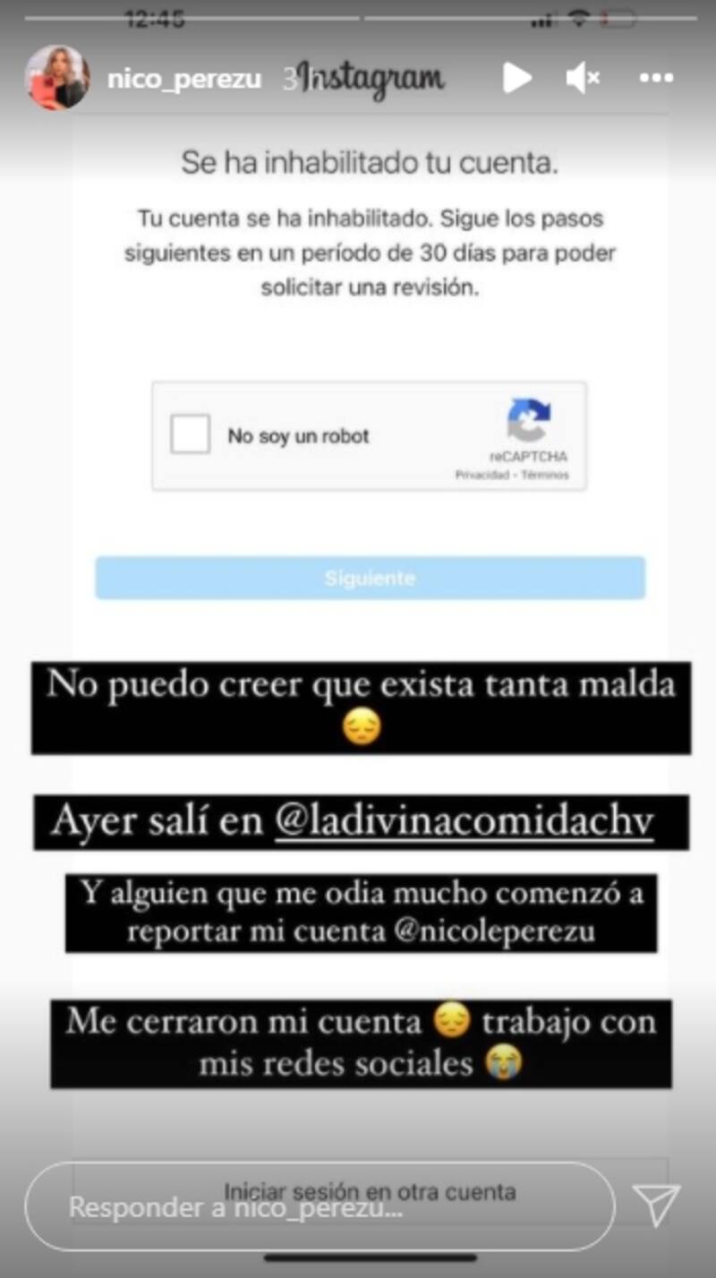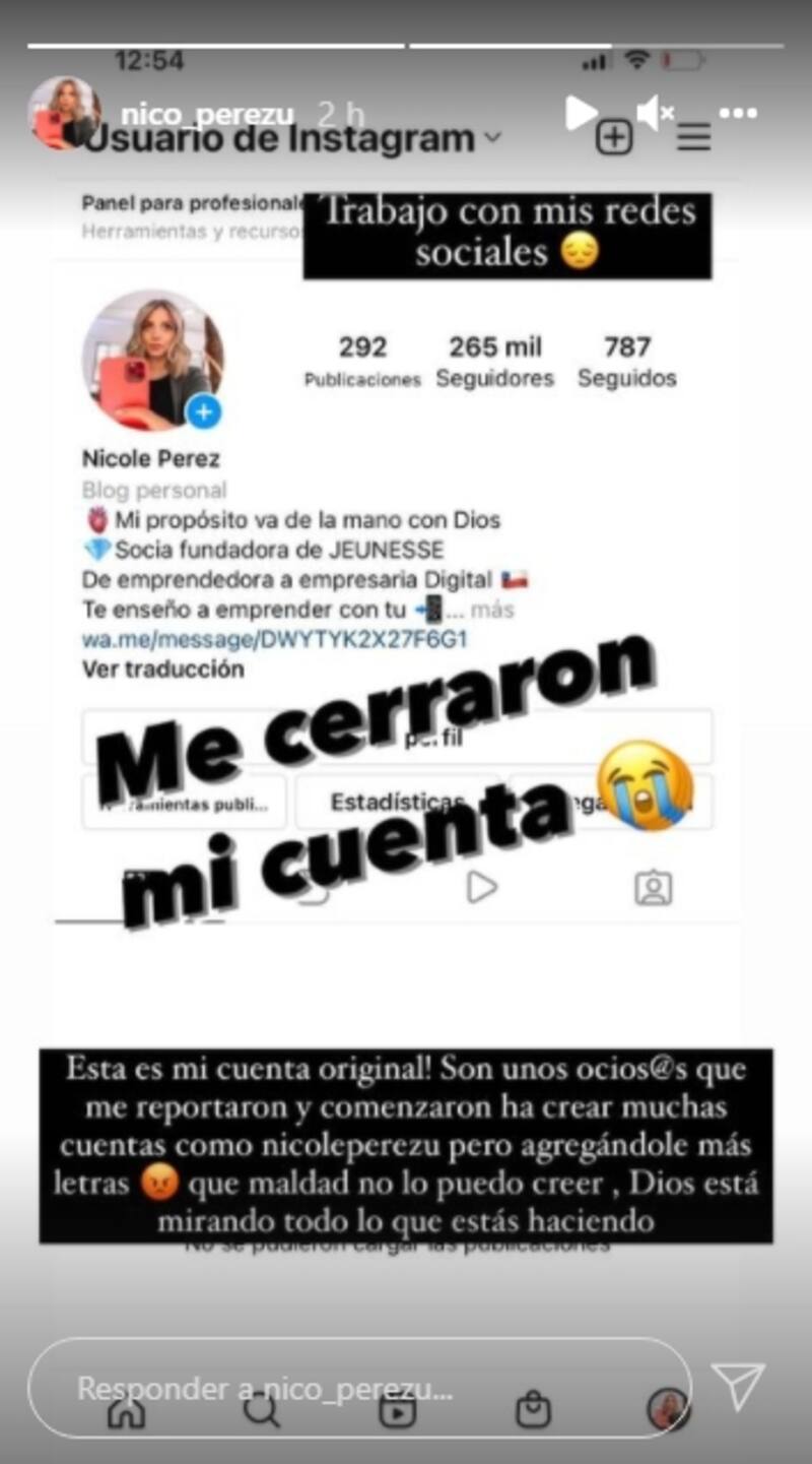 En el mensaje que compartió Nicole Pérez dio a conocer que le cerraron la cuenta y lamentó esta situación, ya que aseguró que su trabajo depende de redes sociales.