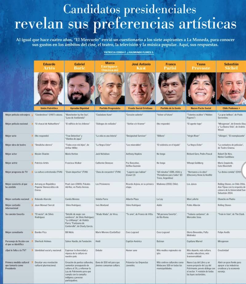 El Mercurio, en la sección de espectáculos de este domingo, publicó un artículo donde los siete aspirantes a La Moneda comentan sus principales gustos, como cuál es la mejor película extranjera a su parecer, la mejor serie, mejor obra de teatro, mejor actor, entre otras categorías.