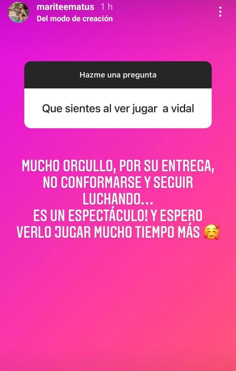 Marité Matus también llenó de elogios a su expareja y padre de sus tres hijos, Arturo Vidal: "Siento mucho orgullo por su entrega, el no conformarse y seguir luchando. Es un espectáculo y espero verlo jugar por mucho más tiempo".