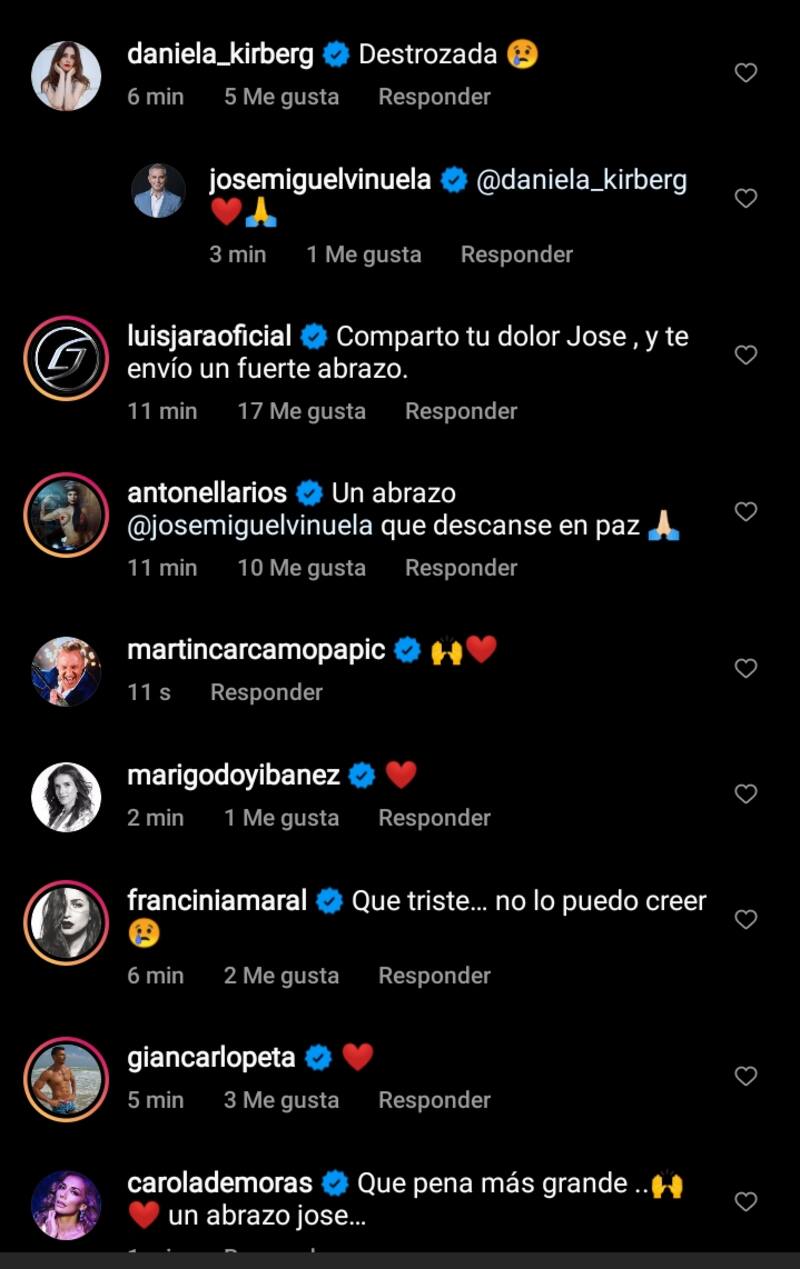 "Un abrazo @josemiguelvinuela que descanse en paz", comentó Antonella Ríos, a quien se le sumó Giancarlo Petaccia y Daniela Kirberg, esta última asegurando estar "destrozada" con la noticia.
