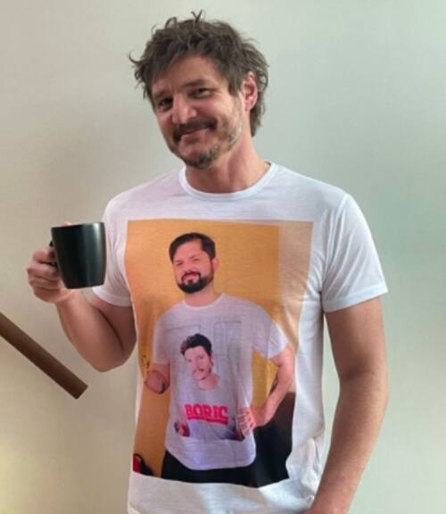 Se trata de la imagen que se viralizó en redes sociales, donde Pedro Pascal usa una polera estampada con una foto del político, quien a su vez está usando una camiseta del actor apoyando a su campaña.