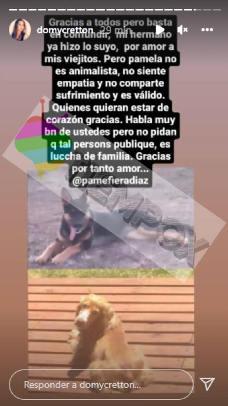 "Gracias a todos, pero basta en confundir. Mi hermano ya hizo lo suyo, por amor a mis viejitos. Pero Pamela no es animalista, no siente empatía y no comparte sufrimiento y es válido", publicó en su propia cuenta la hermana de Jean Philippe Cretton.