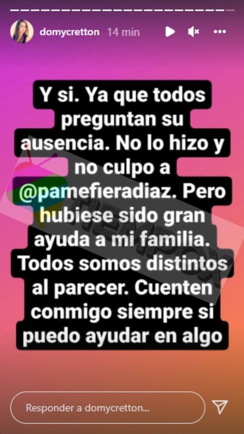 "Y si, ya que todos preguntan su ausencia, no lo hizo y no culpo a Pamela Díaz. Pero hubiese sido una gran ayuda a mi familia. Todos somos distintos al parecer. Cuenten conmigo siempre si puedo ayudar en algo", cerró, exculpando a "La Fiera" por la no difusión.