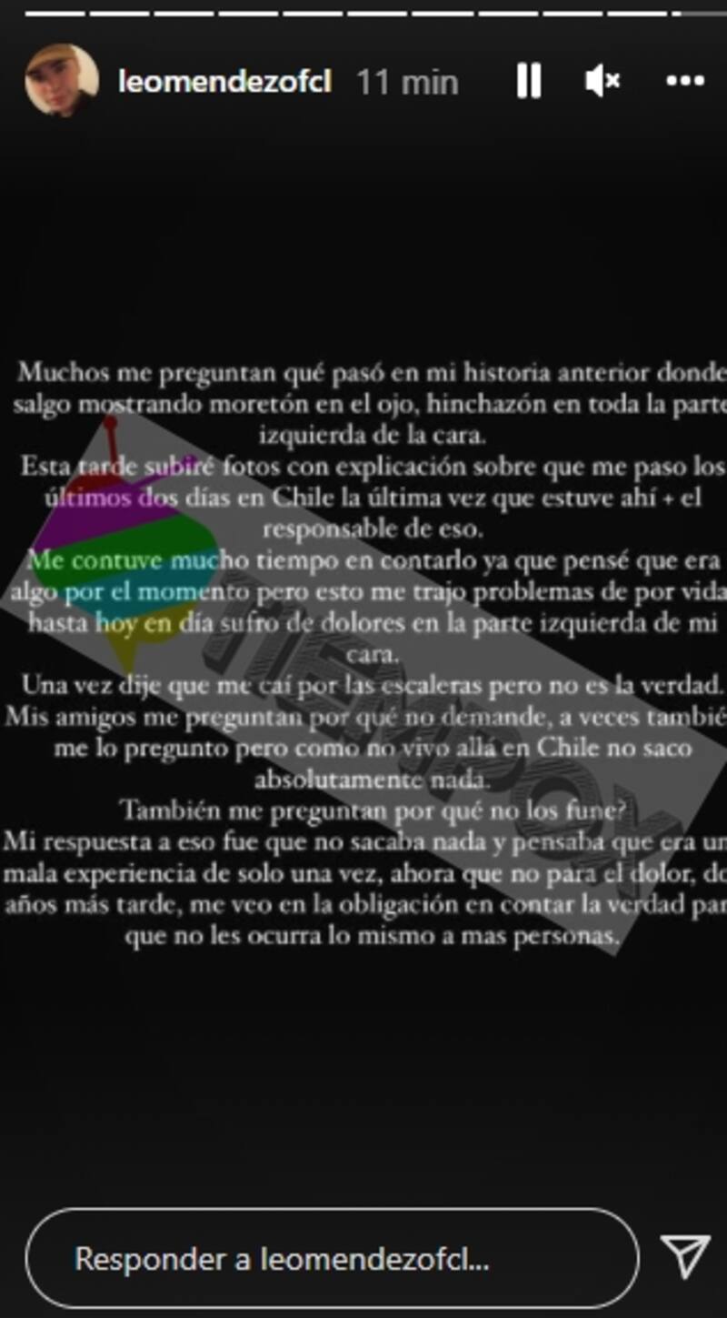 "Muchos me preguntan qué me pasó en mi historia anterior", comenzó en su relato el joven hijo de Dj Méndez, adelantando que durante la tarde "subiré fotos con explicación sobre qué me pasó los últimos dos días en Chile, la última vez que estuve ahí, más el responsable de eso".