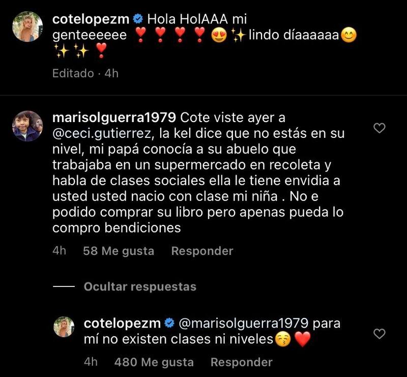 "¿Coté, viste ayer a @ceci.gutierrez? La Kel dice que no estás en su nivel. Mi papá conocía a su abuelo, que trabajaba en un supermercado en Recoleta y habla de clases sociales ella. Le tiene envidia a usted. Usted nació con clase, mi niña", comentó.
