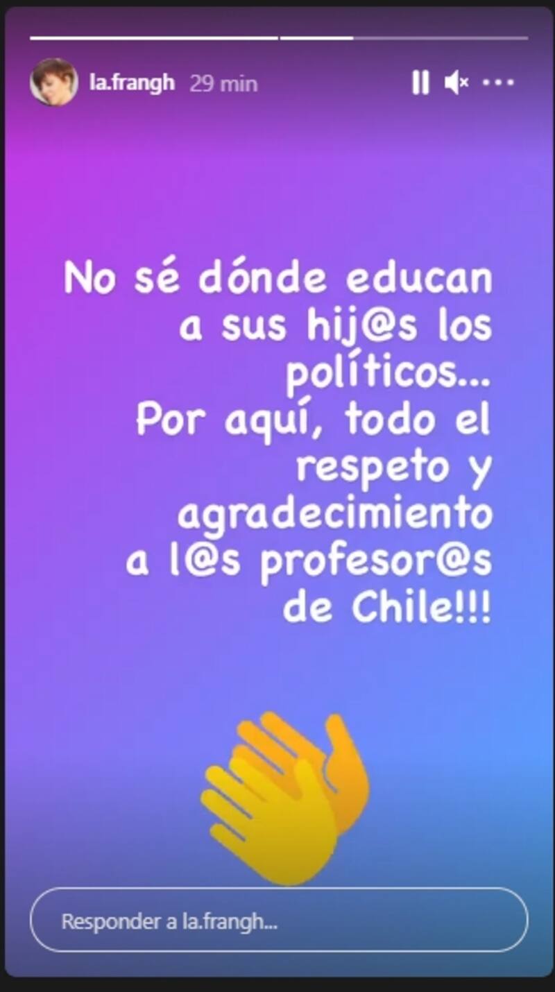 Ante esto, la exrostro de Canal 13 aseveró que “no sé dónde educan a sus hijos los políticos”, recalcando que, “por aquí, todo el respeto y agradecimientos a los profesores y profesoras de Chile".