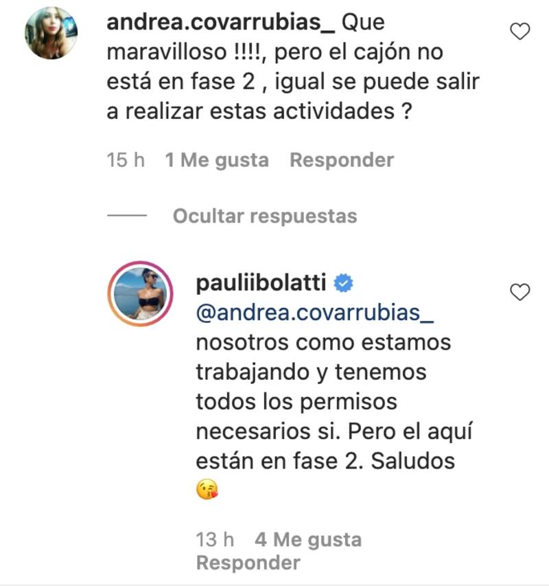 "¡Qué maravilloso! ¿Pero el cajón no está en fase 2? ¿Igual se puede salir a realizar estas actividades?", comentó una seguidora. "Nosotros, como estamos trabajando y tenemos todos los permisos necesarios, sí, pero aquí están en fase 2. Saludos", le respondió Paula Bolatti.