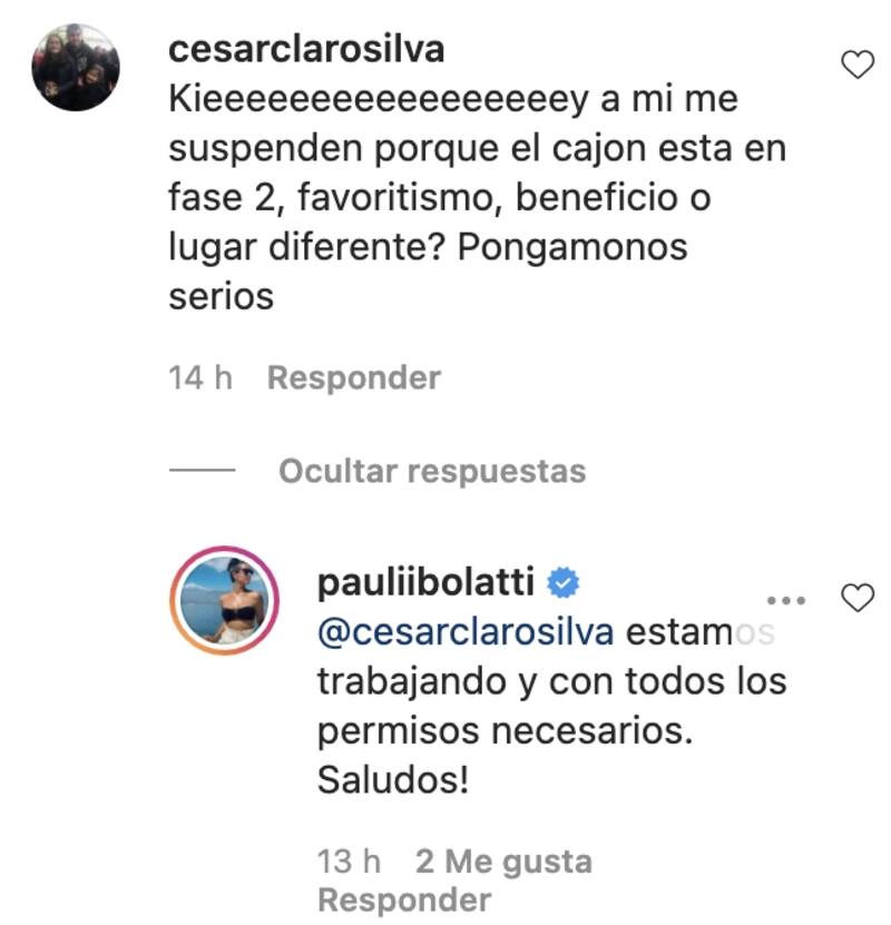 Sin embargo, esta no fue la única crítica que recibió la exchica reality. "¡Qué! y a mí me suspenden, porque el cajón está en fase 2, ¿favoritismo, beneficio o lugar diferente? Pongámonos serios", comentó un usuario. Paula Bolatti le respondió: "Estamos trabajando y con todos los permisos necesarios ¡Saludos!".