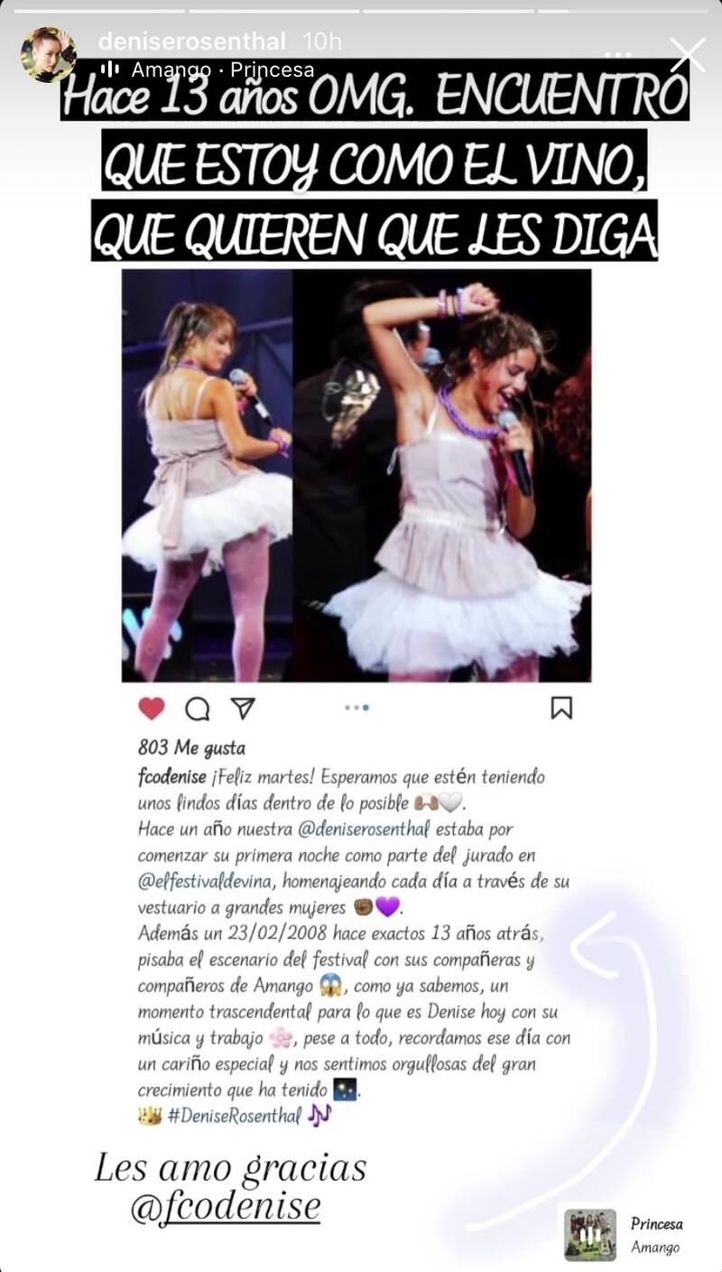 Denise compartió una publicación que hizo su grupo de fans en su cuenta de Instagram, a través de las historias, la cual decía: "Hace un año nuestra @deniserosenthal estaba por comenzar su primera noche como parte del jurado en @elfestivaldevina, homenajeando cada día a través de su vestuario a grandes mujeres".