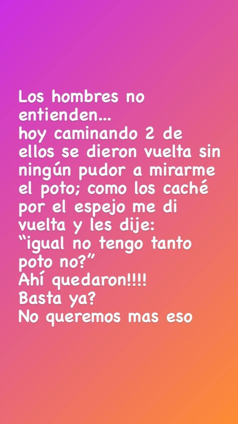 "Los hombres no entienden", partió comentando la conductora, agregando que "hoy caminando 2 de ellos se dieron vuelta sin ningún pudor a mirarme el poto. Como los caché por el espejo, me vi vuelta y les dije: 'Igual no tengo tanto poto, ¿No? Ahí quedaron. ¡Basta ya! No queremos más eso".