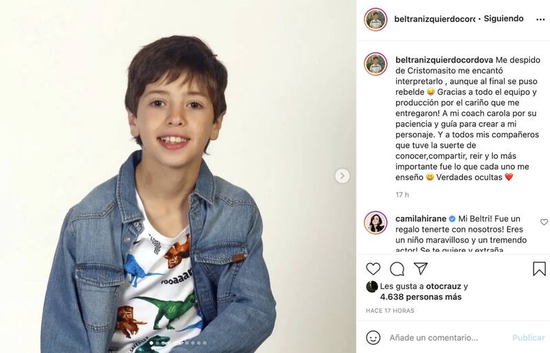 "¡Mi Beltri! ¡Fue un regalo tenerte con nosotros! ¡Eres un niño maravilloso y un tremendo actor! ¡Se te quiere y extraña mucho! ¡Hasta la próxima, mi bebé!", le comentó, junto a un emoji de corazón.