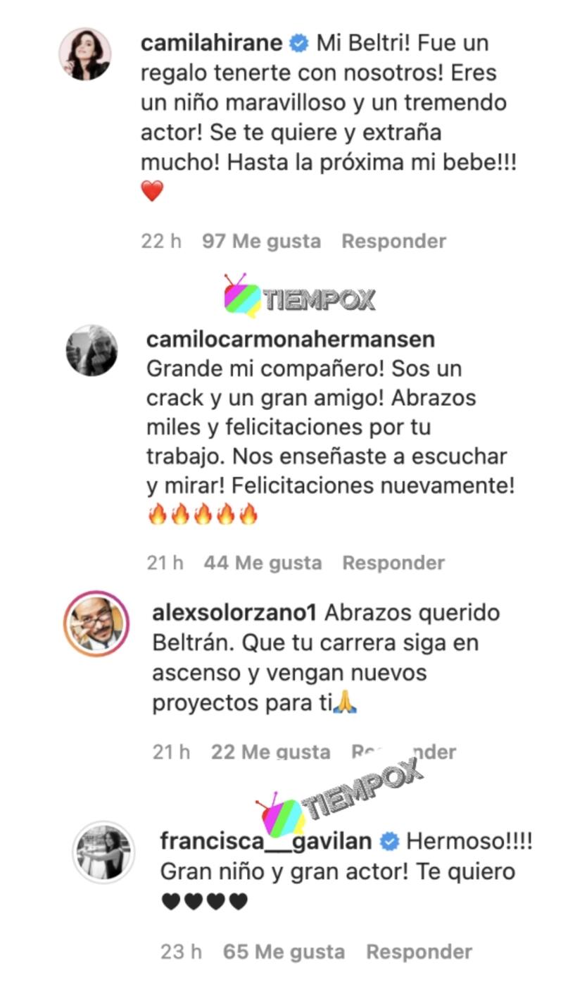 El pequeño compartió un emotivo mensaje en su cuenta de Instagram y aprovechó de agradecerle a todo el equipo y a sus compañeros de elenco por apoyarlo en este proceso. Justamente, algunos actores de la producción, como Camila Hirane y Francisca Gavilán, lo llenaron de elogios por su trabajo en la teleserie y le dedicaron tiernos mensajes de despedida.