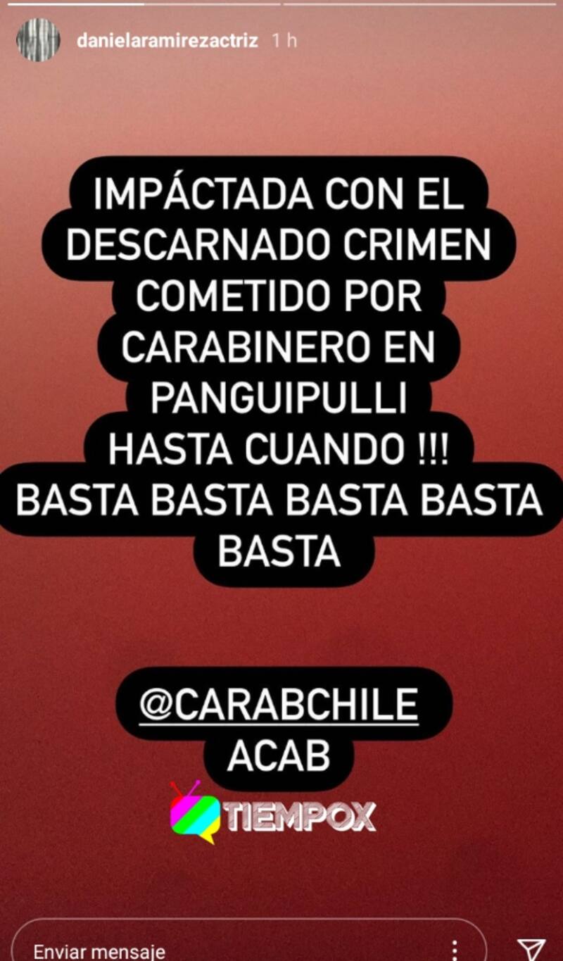 "Impactada con el descarnado crimen cometido por carabineros en Panguipulli. ¡Hasta cuándo! ¡Basta!", dijo en Instagram.