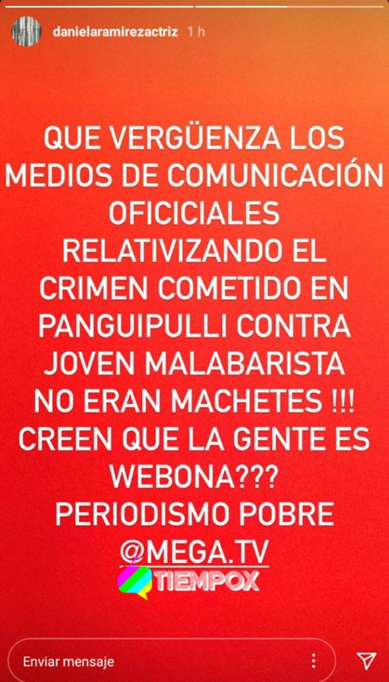 "Qué vergüenza los medios de comunicación oficiales, relativizando el crimen ocurrido en Panguipulli contra joven malabarista. ¡No eran machetes! Creen que la gente es webona. Periodismo pobre @Mega.tv", agregó Daniela Ramírez.