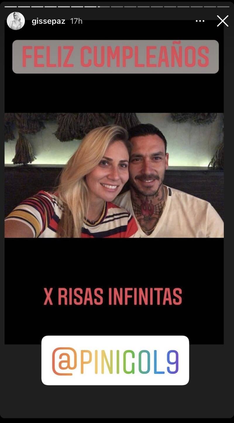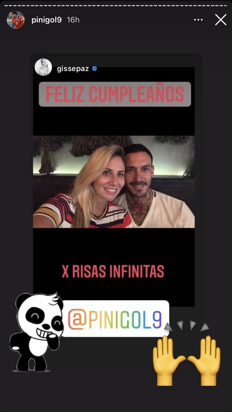 En su cuenta de Instagram, publicó en sus historias una fotografía junto a Pinilla, donde aparecen ambos cercanos y sonriendo. En la postal escribió: "Feliz cumpleaños, por risas infinitas @pinigol9". Si bien el mensaje es poco expresivo, nos da a entender que aún estarían juntos, sumándole las respuestas que compartió hace unos días en la misma red social, negando que estaba pasando un mal momento junto a su esposo. Además, el futbolista compartió la publicación, agregándole unos divertidos emojis.
