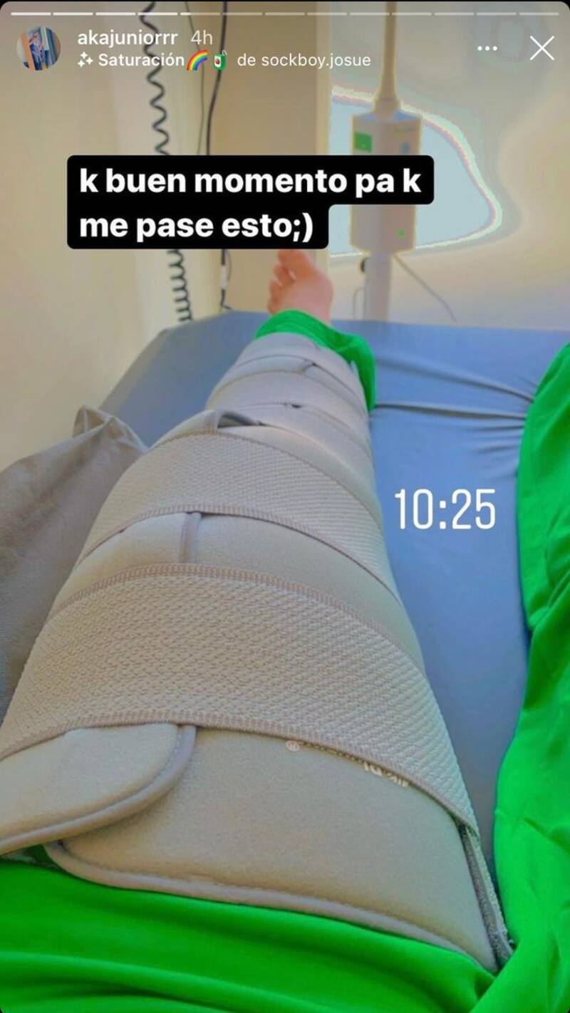 Joaquín Rodríguez García (Aka Junior), el hijo de Julio César Rodríguez y Fran García-Huidobro, de 15 años, sorprendió a sus seguidores en su cuenta de Instagram con una fotografía en las historias donde aparece con una férula inmovilizadora en su pierna izquierda, donde escribió: "Qué buen momento para que me pase esto".