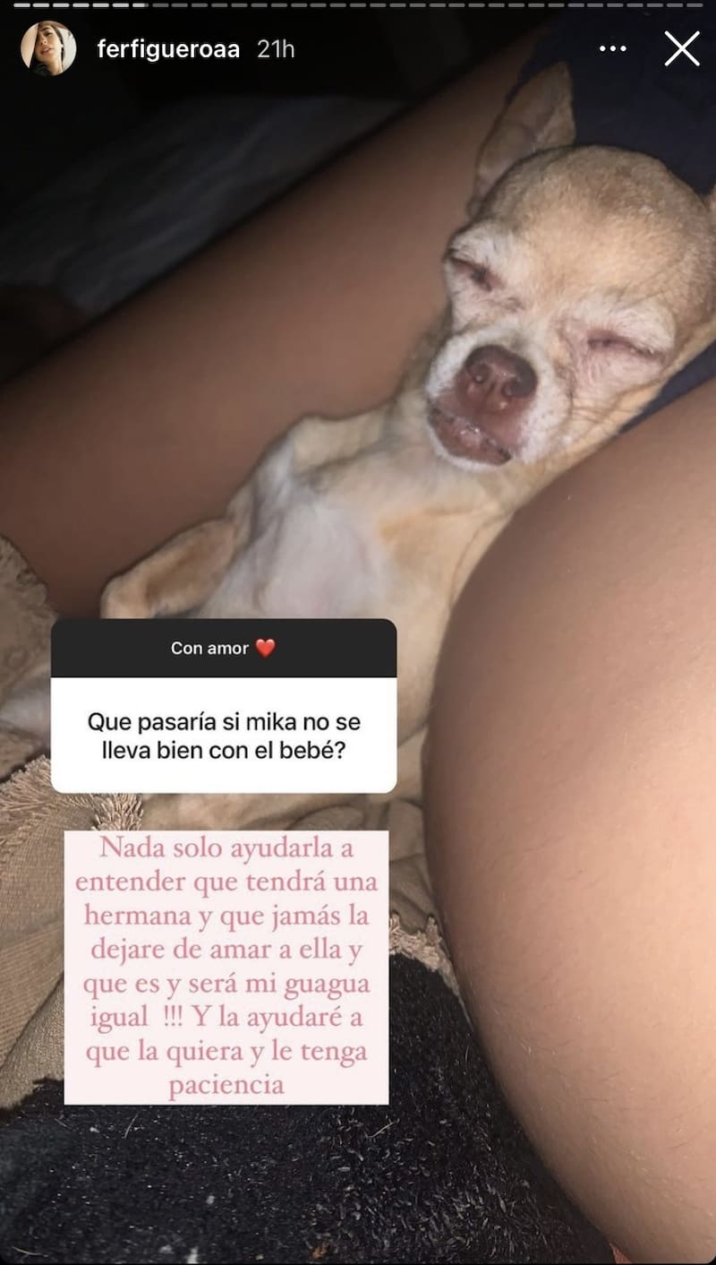 En la dinámica de preguntas en las historias, le preguntaron: "¿Qué pasaría si Mika no se lleva bien con la bebé?". Fer Figueroa respondió: "Nada, solo ayudarla a entender que tendrá una hermana y que jamás la dejaré de amar a ella y que es mi guagua igual. La ayudaré a que la quiera y le tenga paciencia".