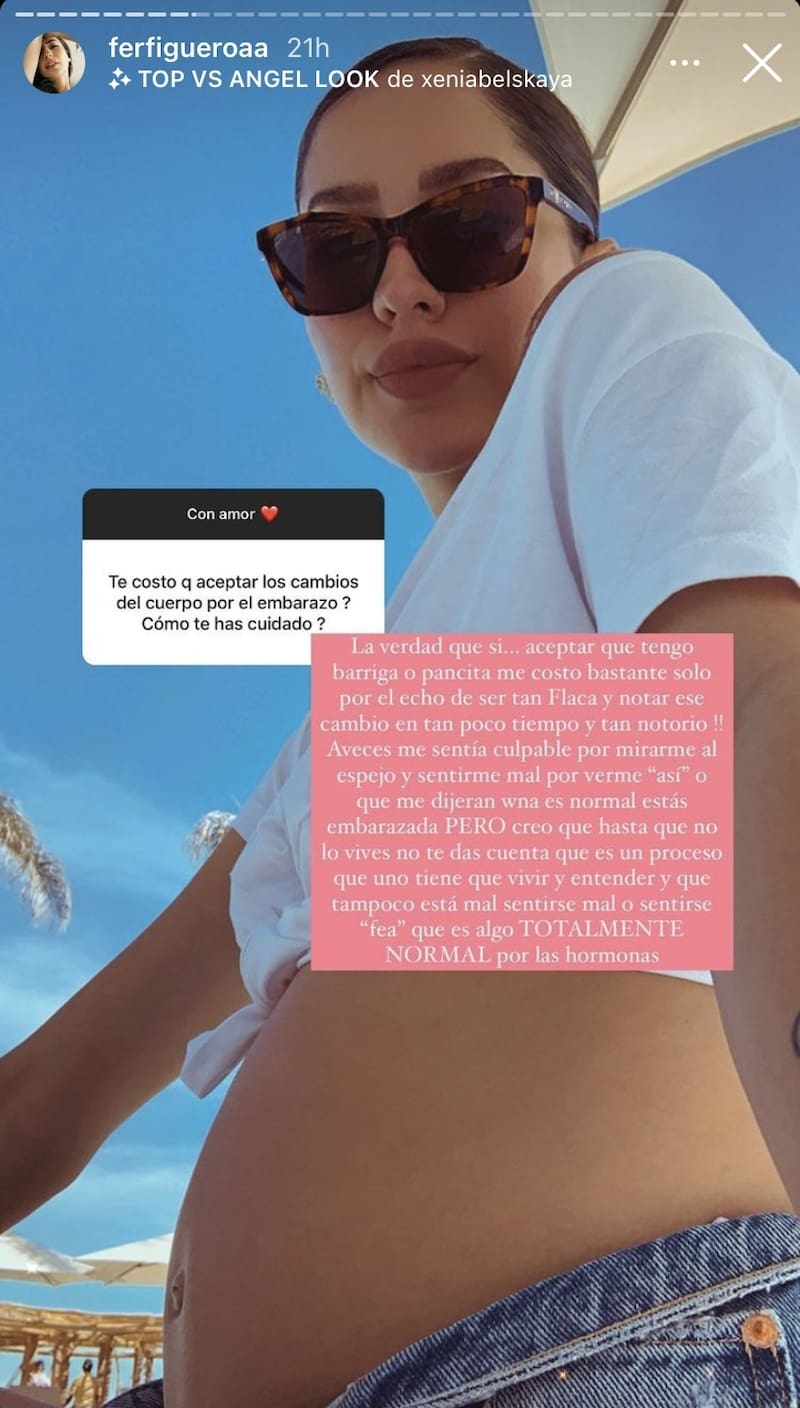 "A veces me sentía culpable por mirarme al espejo y sentirme mal por verme 'así' o que me dijeran: 'Huevona, es normal, estás embarazada'. Pero creo que hasta que no lo vives, no te das cuenta que es un proceso que uno tiene que vivir y entender, y que tampoco está mal sentirse mal o sentirse 'fea', que es algo totalmente normal por las hormonas".