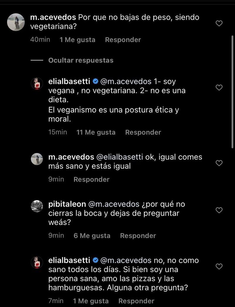 Pero la persona que la criticó no quedó contenta con la respuesta de la exchica reality y le volvió a insistir: "Ok, igual comes más sano y estás igual". La modelo trasandina le insistió: "No, no como sano todos los días. Si bien soy una persona sana, amo las pizzas y las hamburguesas ¿Alguna otra pregunta?". En los mismos comentarios, sus seguidores la apoyaron y criticaron el desubicado comentario que recibió.