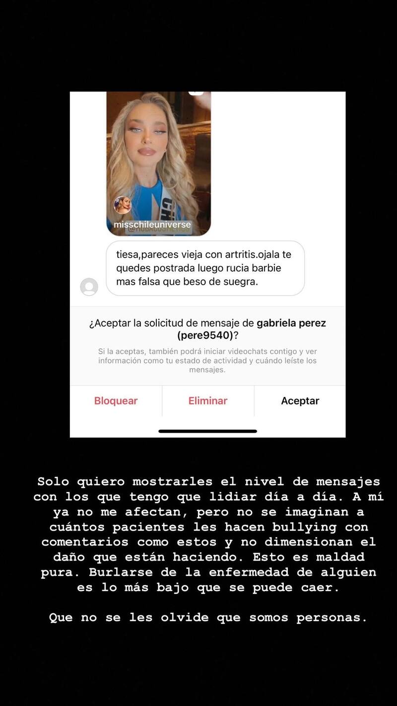 "Esto es maldad pura. Burlarse de la enfermedad de alguien es lo más bajo que se puede caer. Que no se les olvide que somos personas", escribió la Miss Chile.