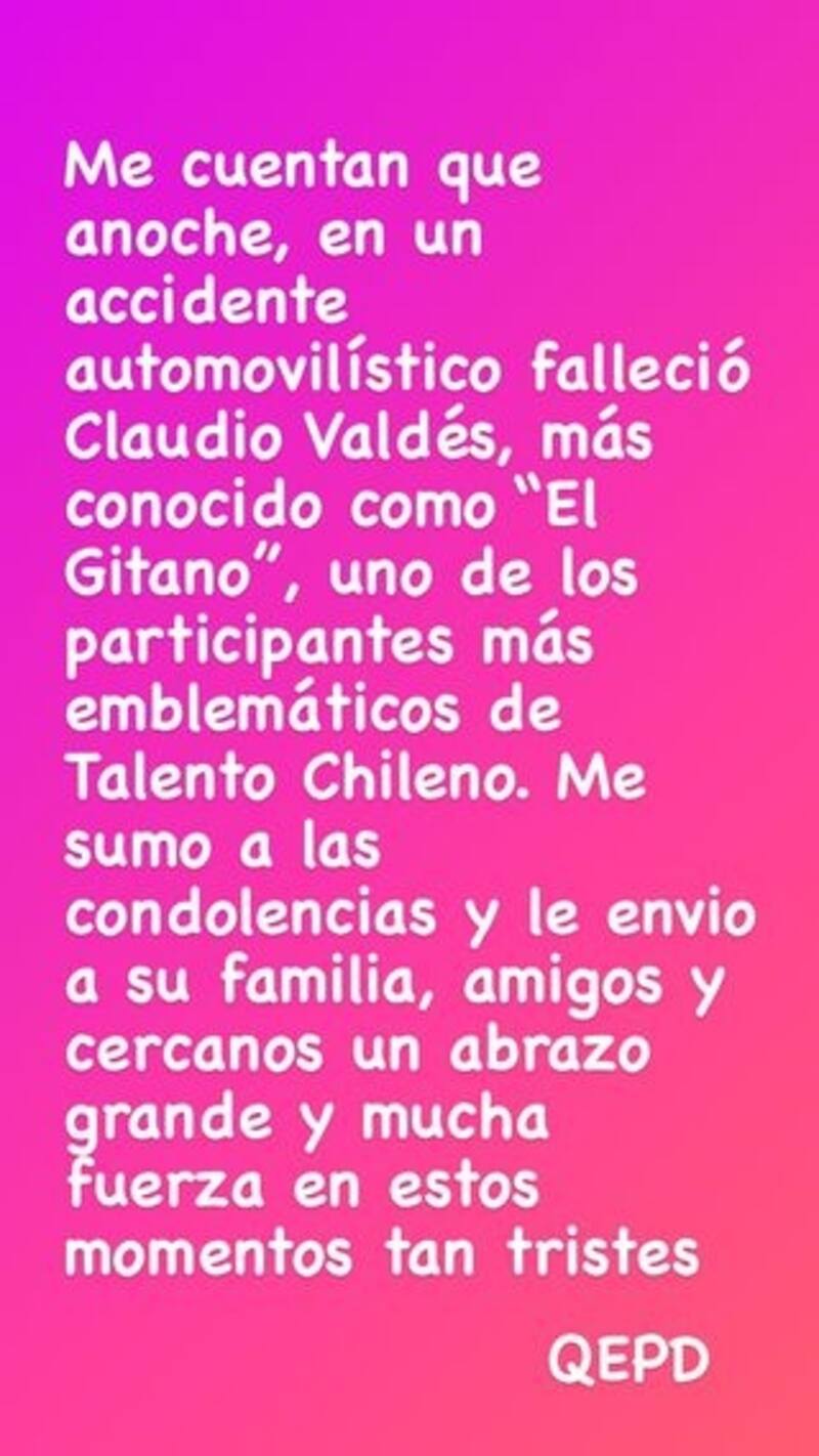 La noticia de Claudio Valdés, "El Gitano", sorprendió a muchos. El joven cantante terminó su vida en un trágico accidente de tránsito, según confirmó Radio BíoBío. Y Fran García-Huidobro, quien conoció al artista, le dedicó un breve y sentido mensaje.