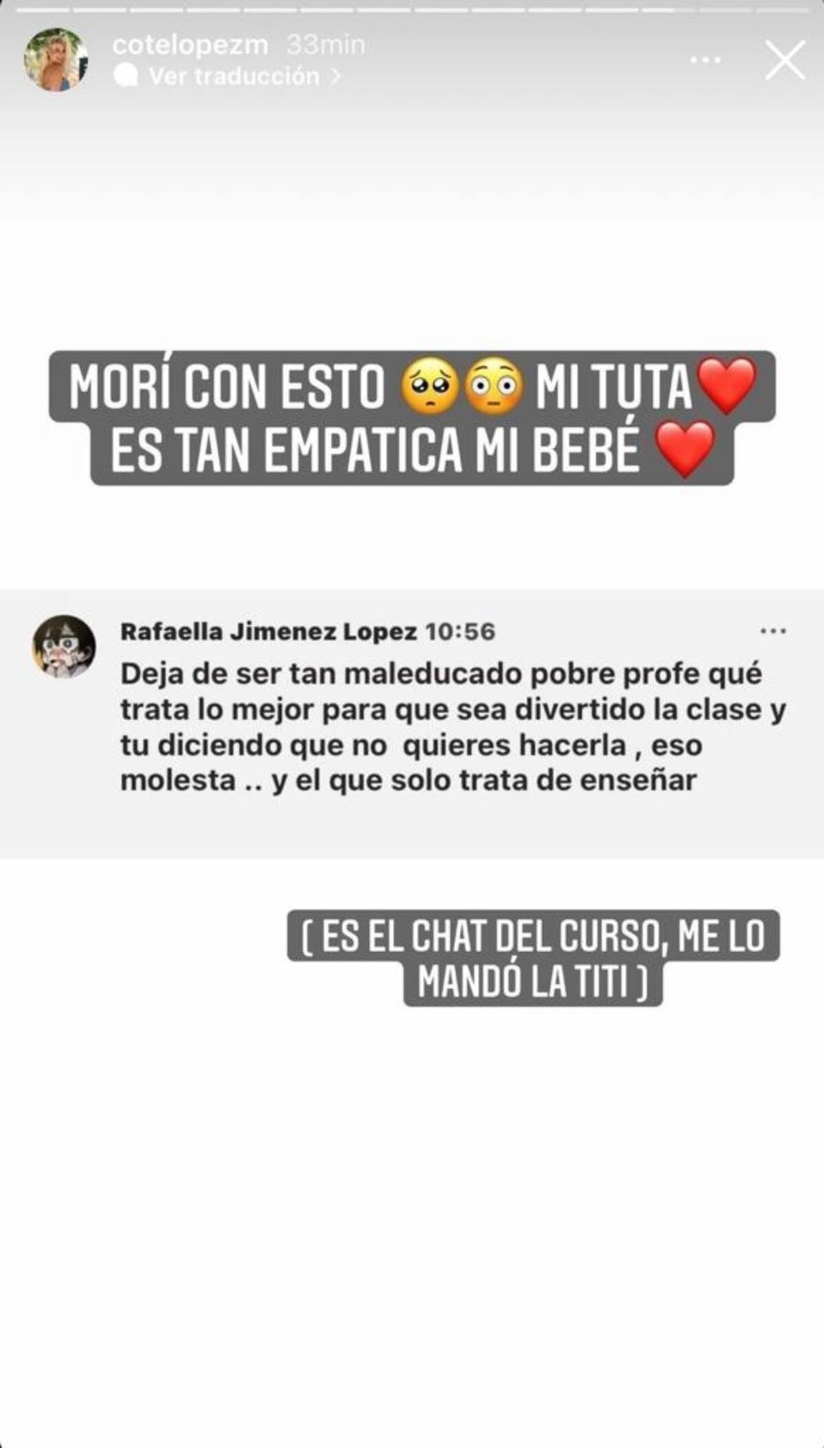 "Deja de ser tan maleducado. Pobre profe que trata lo mejor para que sea divertida la clase y tú diciendo que no quieres hacerla. Eso molesta y él que solo trata de enseñar", escribió Rafaella en el chat, y su hermana Isidora le compartió la imagen a Coté López.