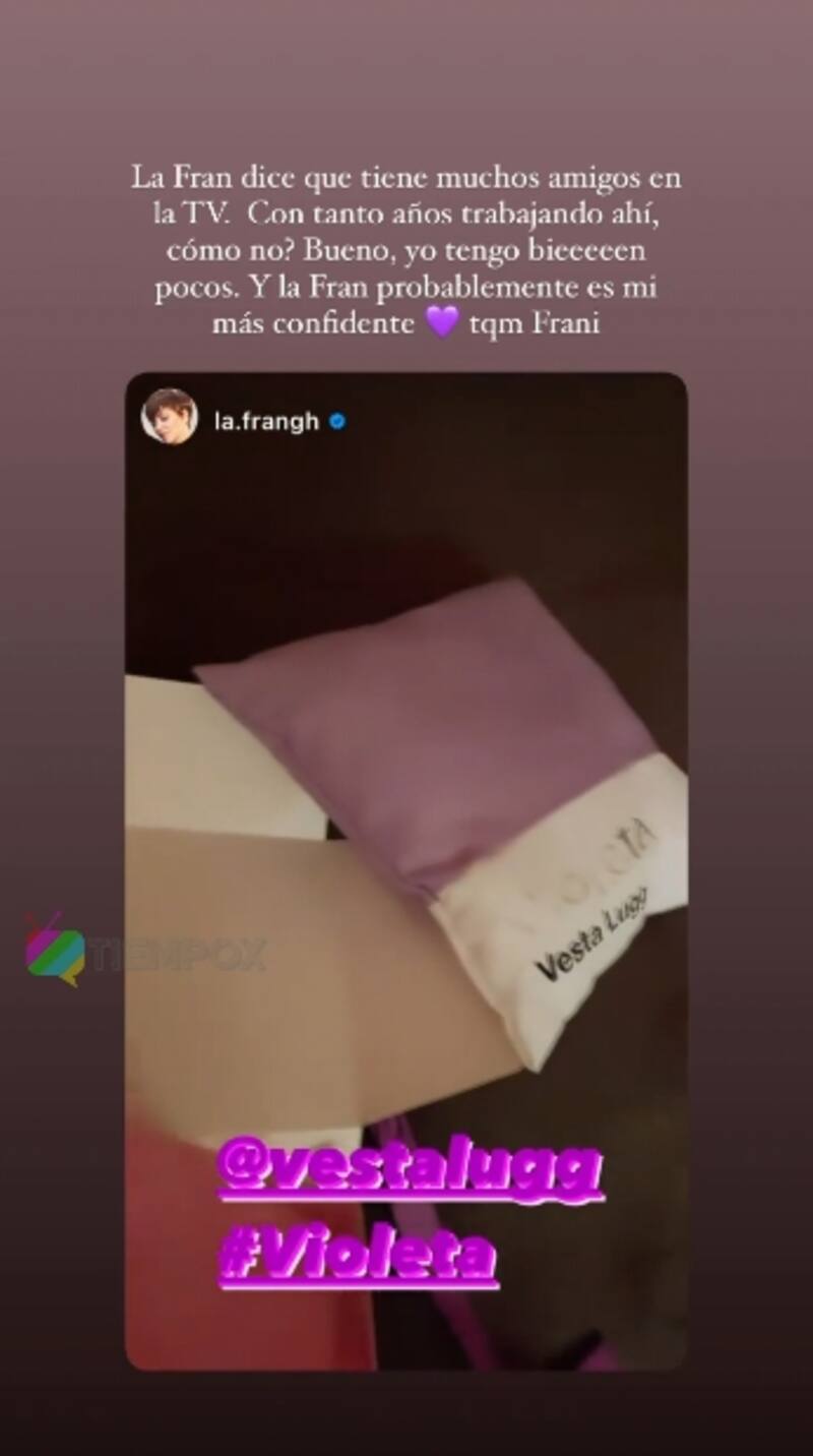 "La Fran dice que no tiene muchos amigos en la TV. Con tantos años trabajando ahí, ¿cómo no? Bueno, yo tengo bien pocos. Y la Fran es probablemente mi más confidente", escribió Vesta Lugg en sus historias de Instagram.