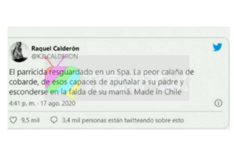 "El parricida resguardado en un Spa. La peor calaña de cobarde, de esos capaces de apuñalar a su padre y esconderse en la falda de su mamá. Made in Chile", señaló, para luego borrar el mensaje de sus redes sociales.