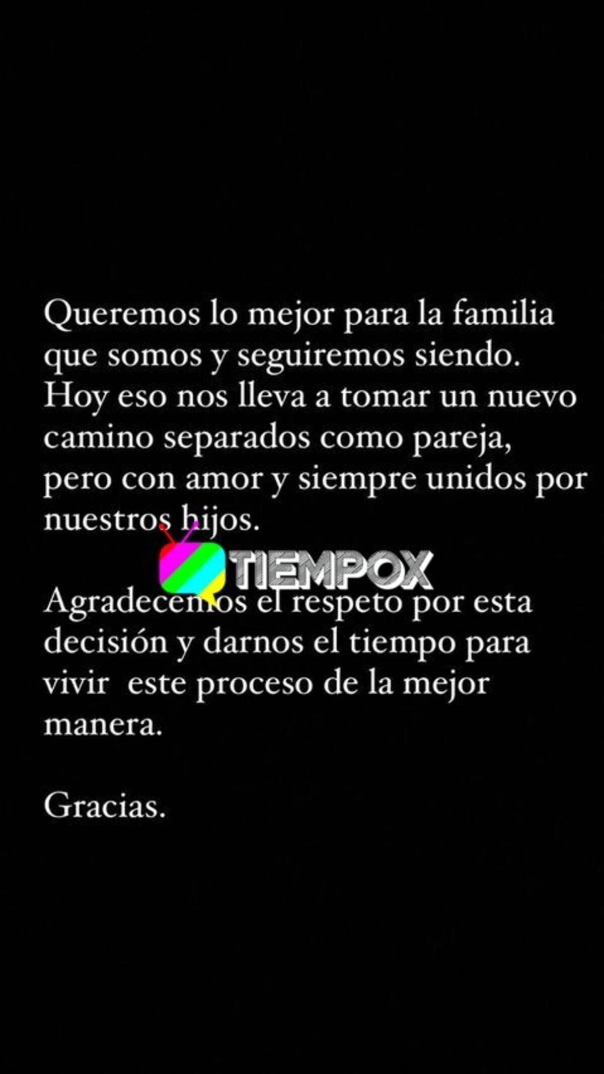 "Queremos lo mejor para la familia que somos y seguiremos siendo. Hoy eso nos lleva a tomar un nuevo camino separados como pareja, pero con amor y siempre unidos por nuestros hijos", partió comentando el protagonista de "Demente".
