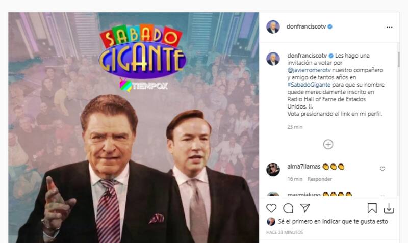 "Les hago una invitación a votar por @javierromerotv nuestro compañero y amigo de tantos años en #SabadoGigante para que su nombre quede merecidamente inscrito en Radio Hall of Fame de Estados Unidos", escribió el animador nacional.