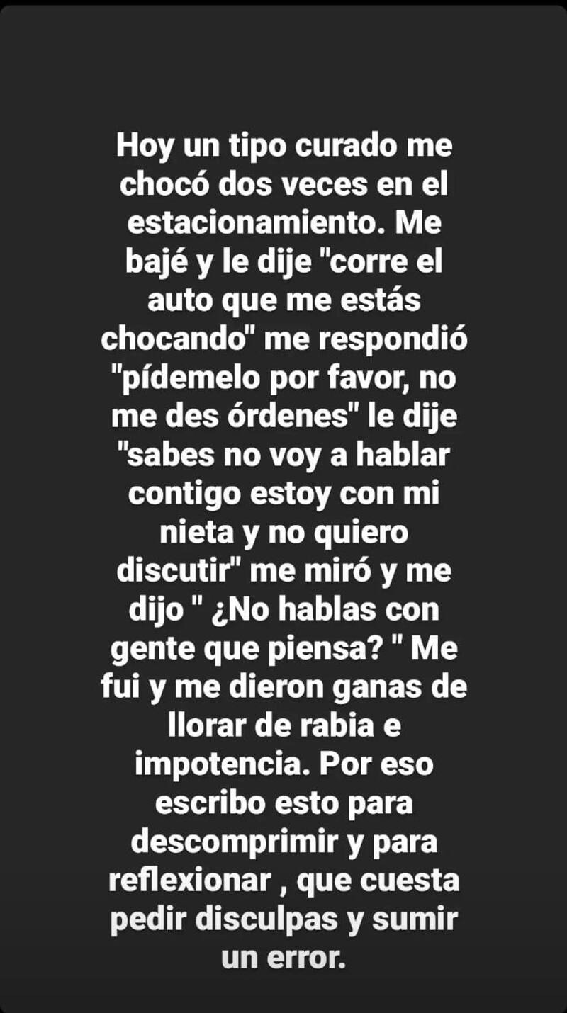 "Hoy un tipo curado me chocó dos veces en el estacionamiento. Me bajé y le dije 'corre el auto que me estás chocando'. Me respondió 'pídemelo por favor, no me des órdenes'", comenzó a relatar el intercambio de palabras que sustuvo.