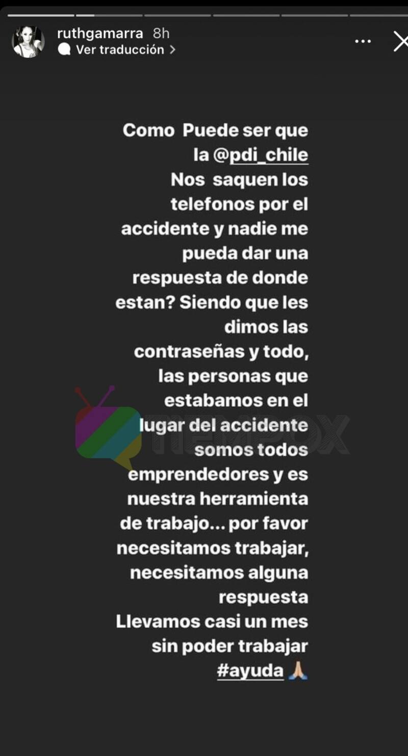 "¿Cómo puede ser que PDI nos saquen nuestro teléfonos por el accidente y nadie me puede dar una respuesta de dónde están? Dimos las contraseñas y todo", partió contando Ruth Gamarra en sus historias de Instagram.