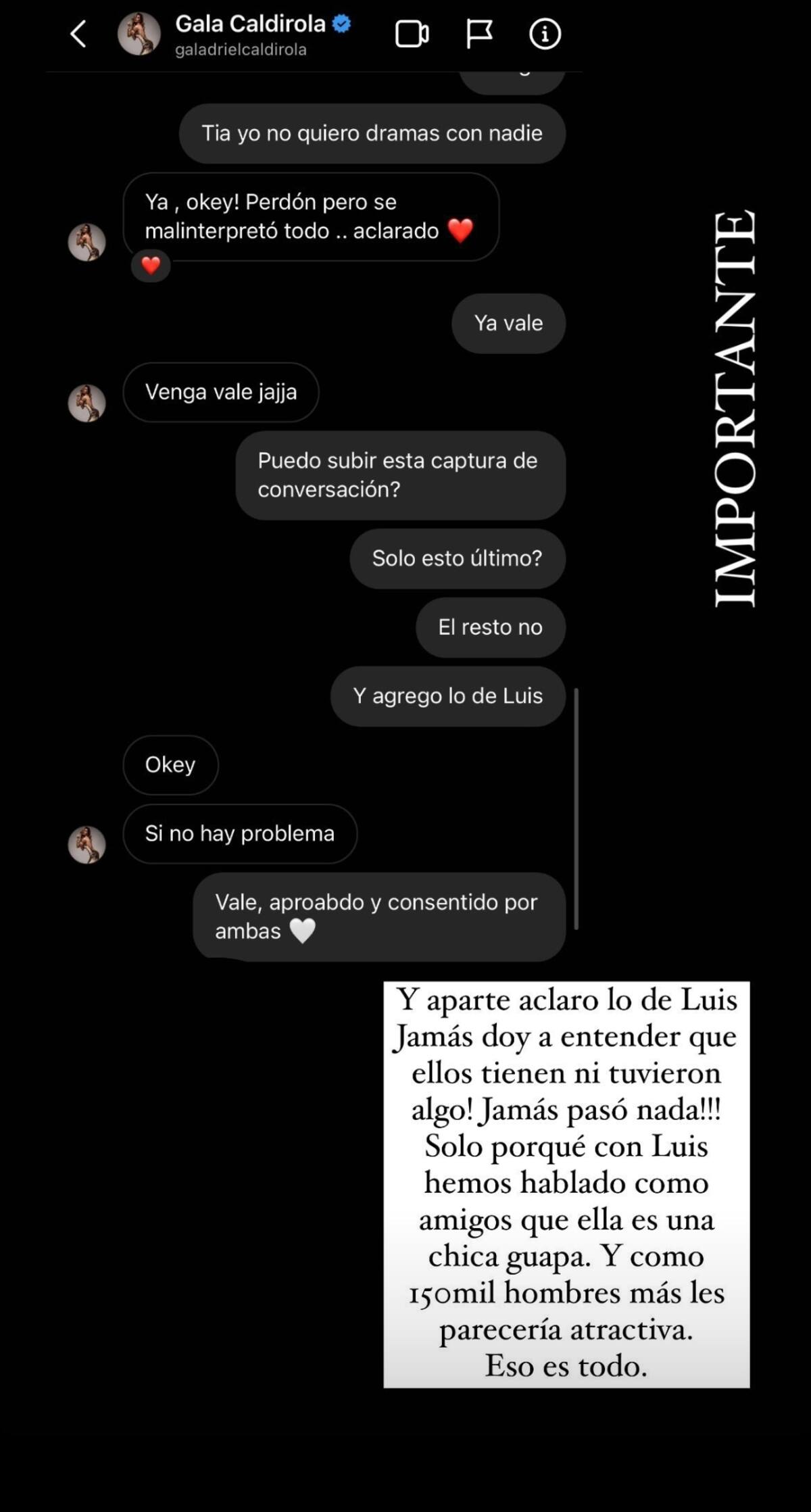 La trasandina no quiere entrar en problemas con la modelo y compartió en su cuenta de Instagram la conversación entre ella y Gala Caldirola para finalizar el tema: "Aparte aclaro lo de Luis. Jamás doy a entender que ellos tienen ni tuvieron algo, jamás pasó nada", aclaró en sus redes sociales Aylén Milla.