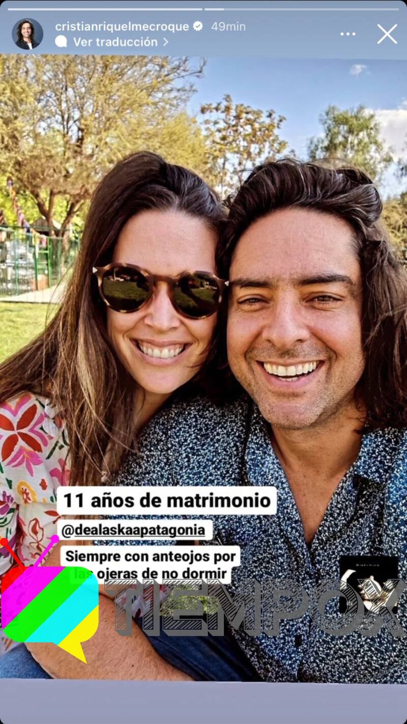 Ahora, Cristián Riquelme quiso celebrar su aniversario N°11 de matrimonio junto a Claudia Quinzio. En la publicación, el actor escribió un chistoso mensaje. "Siempre con anteojos, por las ojeras de no dormir", redactó, puesto que su señora salía en la foto con lentes. También, el intérprete le dedicó una romántica canción a este lindo momento, "Promise me", de Beverly Craven.