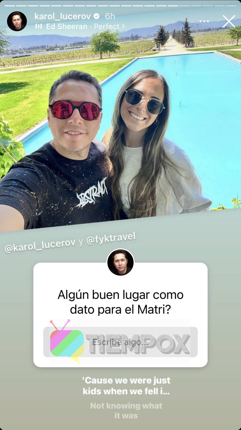 Además, compartió en sus historias la misma fotografía junto a Fran Virgilio, con la típica caja de preguntas para que le puedan escribir sugerencias de lugares. "¿Algún buen lugar como dato para el matri?", escribió con la canción "Perfect" de Ed Sheeran de fondo.