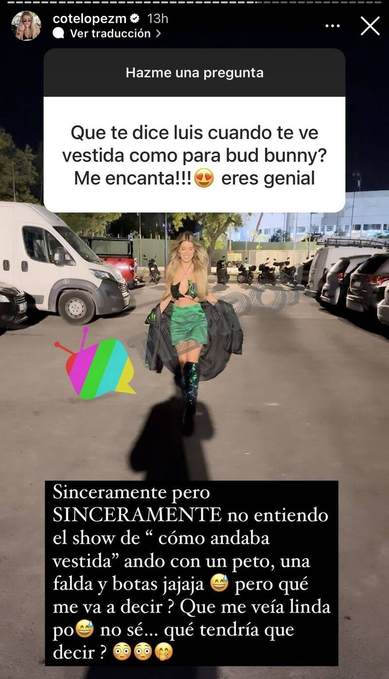 Es así que Coté López estuvo respondiendo varias preguntas de sus seguidores y una de ellas decía: "¿Qué te dice Luis cuando te ve vestida como para Bad Bunny? ¡Me encanta! Eres genial".